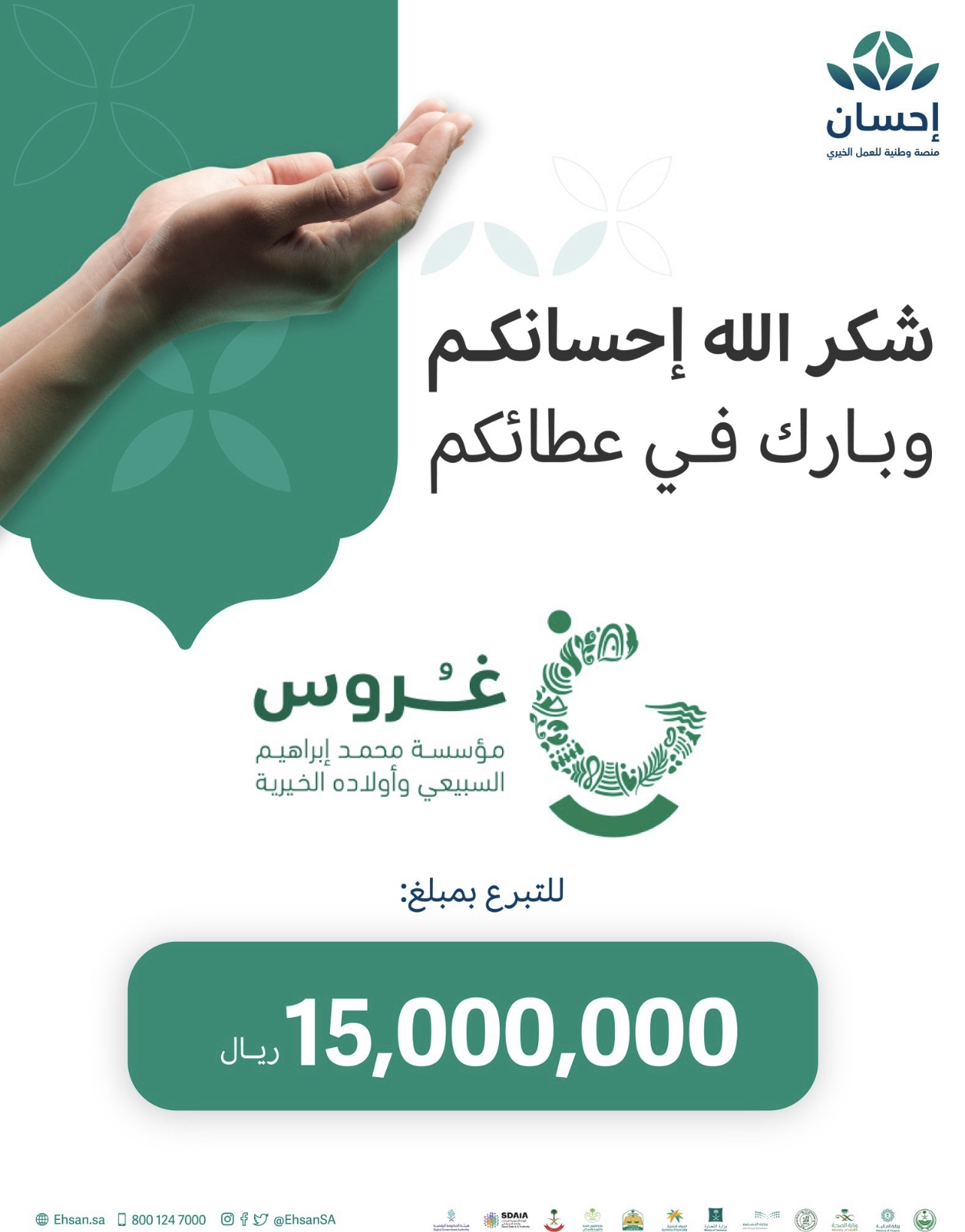 أعلن الأمين العام لمؤسسة محمد إبراهيم السبيعي وأولاده الخيرية “غروس” مشاركة المؤسسة في الحملة الوطنية للعمل الخيري في نسختها الثالثة (رمضان 1444هـ – 2023م) بالتبرع بمبلغ خمسة عشر مليون ريال (15.000.000) مع انطلاق الحملة عبر منصة إحسان للعمل الخيري.