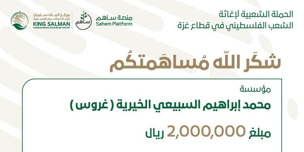 بادرت مؤسسة محمد إبراهيم السبيعي وأولاده الخيرية “غُروس” بدعم الحملة السعودية الشعبية لإغاثة الشعب الفلسطيني الشقيق في قطاع غزة بمبلغ (2) مليون ريال، بالتنسيق والتعاون مع مركز الملك سلمان للإغاثة والأعمال الإنسانية.