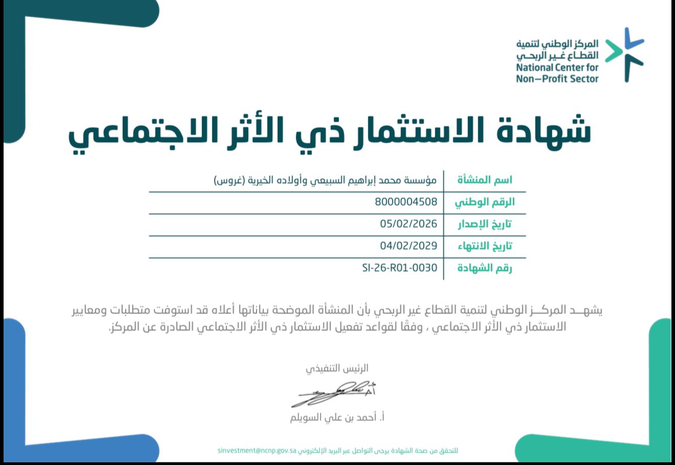 حصلت مؤسسة محمد إبراهيم السبيعي وأولاده الخيرية (غُروس) في 08 فبراير 2026م على شهادة الاستثمار ذي الأثر الاجتماعي من المركز الوطني لتنمية القطاع غير الربحي، لتكون بذلك أول مؤسسة مانحة في القطاع غير الربحي تمتلك كيانات ومبادرات متنوعة وفعلية في مجال الاستثمار الاجتماعي منذ عام 2020م.